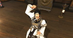 上は「勝利を喜ぶ」エモートを使ったのに対して、こちらは白魔の攻撃魔法グレアを使った。どうしても右足がコートと干渉する瞬間しかSS撮影されないので、これで妥協する。